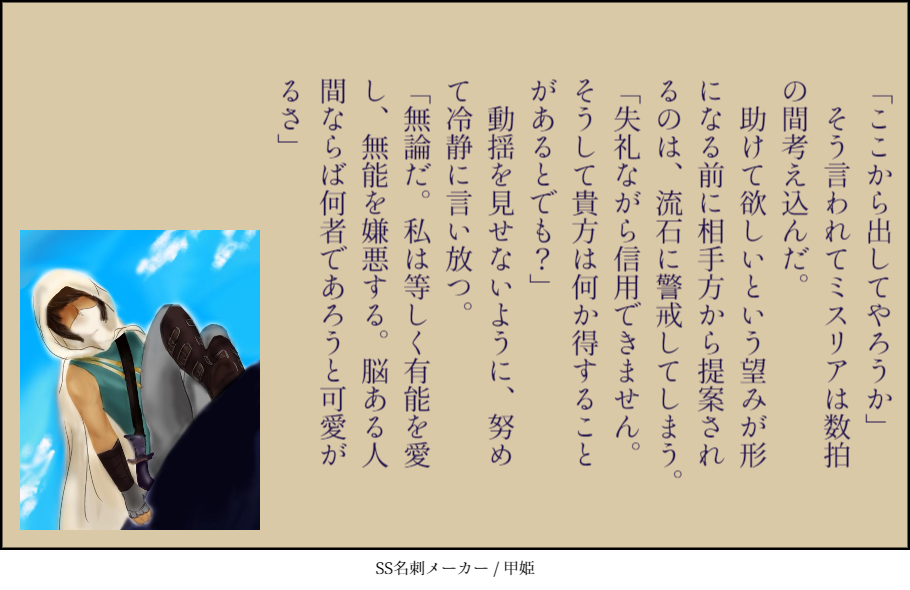 七ツ海のホストが昨日? から迷子です。どうしたのかしら。二話を更新したかったのに。 だからと言って私のサイトです、火急の何かがあるわけでもないので、あと一日だけ待ってお問い合わせしようかと思います。 ちなみに最近、この曲 http://rocklyric.jp/lyric.php?sid=165804/The+Puzzle/MY+FIRST+STORY で黒赤のOPとか妄想するのがマイブームです。このギターリフのところでラピスマトリクスがくるくる、とかサビに入ると砂塵が舞って馬を走らせる、とか。別に少年漫画じゃないのだけどw 双星の陰陽師のOPみたいなのがいいですね。主人公たちめっちゃ走ってめっちゃ戦ってる(だからそんな話ではない) 余談、母性本能って都合の良―― じゃない、とてもオイシイ言葉ですよね。 ダメな男を養いたくなるのも元を辿ればそれなのかと思うとぞっとしますが(友人が無職の彼氏と別れるかどうかという話を昨日聞いた)、ほどよいダメさは好き。ダメさというか、落ちている時にドキッとなって支えてやりたくなるのです。でもちょっと「支えてやりたい」という感情を俯瞰すると、本気で助けようとしてるんじゃなくてダメなあんたは可愛いわねみたいな気持ちが混じってて、邪だなあって思います。 ……何を言っているんだ。 気を取り直して、余談。作中で身長が等しいといわれていますが正確には169cmと171cmって感じです。セリカは大体サンダル(底低い)でエランは大体長靴(ちょっと底厚い)なので外で会うと5,6cm差になります。よほど接近しない限りは目線の高さが一緒のように感じます。帽子ORターバンの高さはノーカン。 3話は明日くらいから投稿始めようかなと思ってます。思ってるだけで実際は明後日になるかもしれません。 では、おたのしみに! |